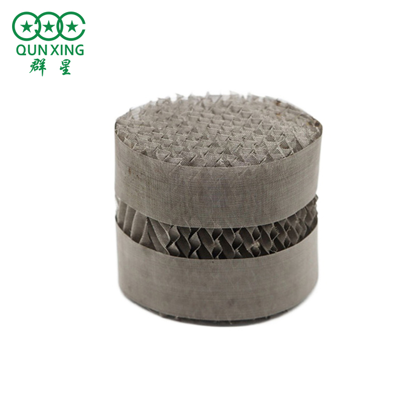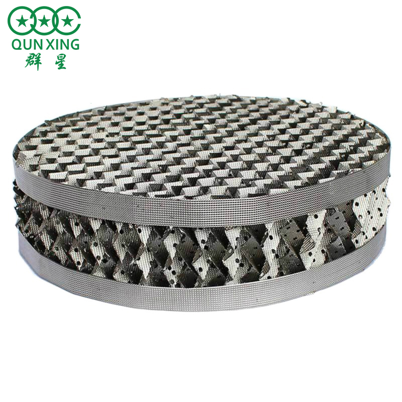 孔板波紋填料是規(guī)整填料的一種。它是由若干彼此平行,垂直排列表面有溝紋的孔板片組成,波紋與塔軸方向成一定夾角,相鄰板片波紋方向相反,使板片間形成交叉三角形通道,因此具有以下特點(diǎn):