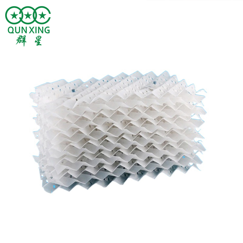 (1)幾何特性 塑料板波紋填料與金屬板波紋填料結(jié)構(gòu)相似,是由彼此平行、交 叉后垂直排列的波紋板片組成盤型的規(guī)整填料。填料板片上可開有小孔以提高分離能力。組成盤狀的填料在塔中上、下相鄰的兩盤應(yīng)交錯(cuò)90°。未經(jīng)處理的塑料一般有憎水性能,必要時(shí)可通過物理、化學(xué)等方法來改善塑料的潤濕性能。塑料板波紋填料的基本特性參數(shù)主要取決于填料板片的波紋峰高,而決定波紋形狀的主要參數(shù)尚有傾角、波距、板厚等因素,其原理與金屬板波紋填料相似。